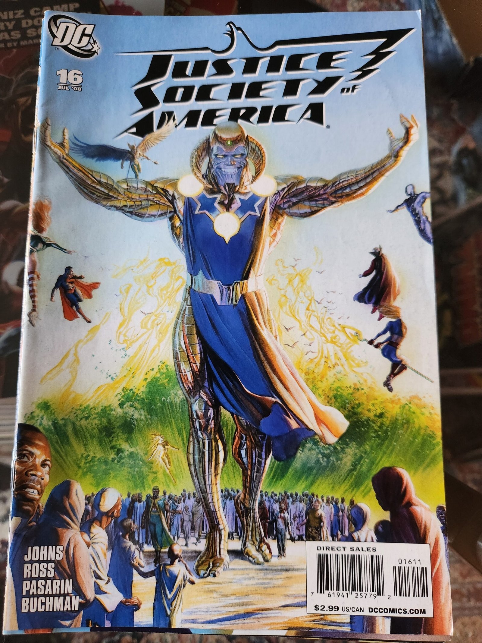 Justice Society of America #16 is titled “One World, Under Gog!” and marks a dramatic shift in the “Thy Kingdom Come” storyline. After the powerful giant Gog emerges from the temple wall in the Congo, the conflict transforms from a battle against a zealous villain into a moral debate about faith, power, and the nature of salvation.