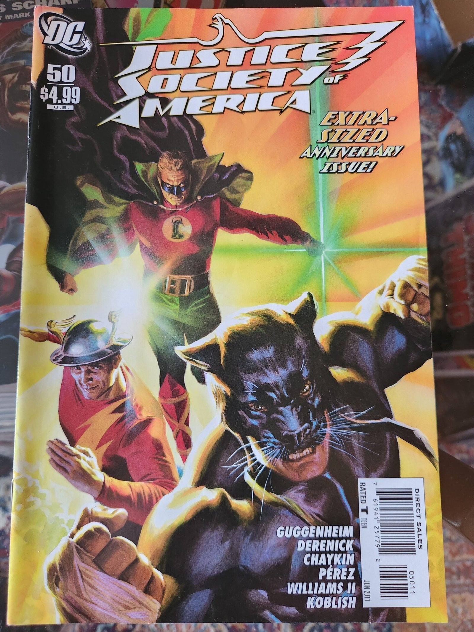 Justice Society of America #50 is an extra-sized spectacular that serves as a celebration of the milestone issue, bringing together an all-star roster of artists (including George PĂ©rez) and incorporating elements of the team’s past, present, and future.