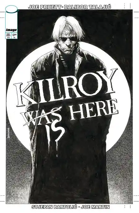 Throughout history, KILROY, a being of unknown origin and power, has been cursed to wander the Earth, avenging the innocent and protecting the weak, always leaving his trademark signature “Kilroy Was Here” to mark his presence. But what if his life has been a lie? The war to end all wars is imminent. Which side will he choose? From Eisner Award winner JOE PRUETT (VIKING MOON, VOICES IN MY HEAD, X-Men) and legendary artist DALIBOR TALAJIC (Deadpool, THE KIDS, Hit-Monkey) comes this tale of timeless horror. What would you do if you could decide the fate of the world?