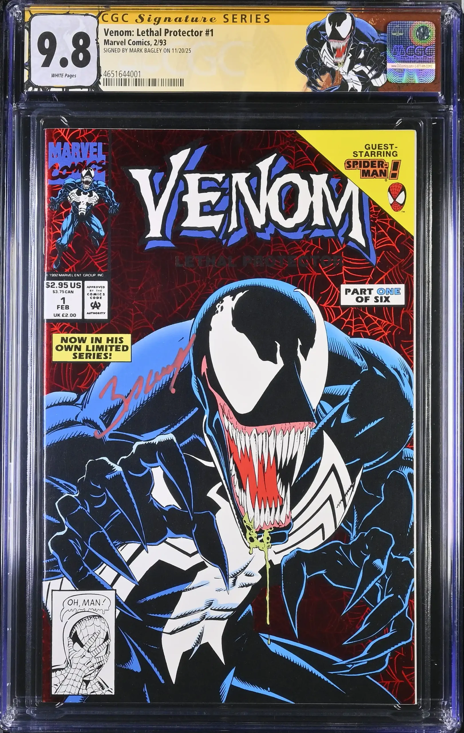 Venom: Lethal Protector – Signed Mark Bagley 9.8$325.00 Tax 1 in stock Venom: Lethal Protector - Signed Mark Bagley 9.8 quantity Add to cart Categories: CGC Comics, Comics, Marvel Description Additional information Description CGC Cert # 4651644001 Title Venom: Lethal Protector Issue 1 Issue Date 2/93 Issue Year 1993 Publisher Marvel Comics Grade 9.8 Page Quality WHITE Grade Date 2025-12-11 Label Category Signature Series Art Comments David Michelinie story Bagley, de la Rosa & Milgrom art Mark Bagley & Sam de la Rosa cover Key Comments 1st Venom in his own title. Spider-Man appearance. Red holo-grafx foil cover. Signatures SIGNED BY MARK BAGLEY ON 11/20/25 Additional information Weight 1 lbs Related products Amazing Spider-Man #363 (Signed by Bagley/Emberlin) CGC 9.0 $250.00 Tax Add to cart Tomb Raider #1/2 (Wizard Mail Exclusive) 9.0 $50.00 Tax Add to cart Spider-Man #13 8.5 Read more Tomb of Dracula #68 6.5 $75.00 Tax Add to cart